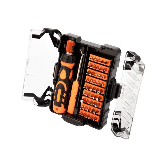 Реверсивная отвертка с набором бит отлично подходит для ремонта телефонов, компьютеров, приемников и других приборов, которые используются в быту. Инструмент выполнен из высококачественной хромованадиевой стали CR-V с высокой устойчивостью к коррозии и образованию ржавчины.
