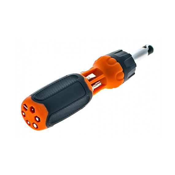 Трещоточная отвертка 7 в 1 предназначена для обслуживания резьбовых соединений. В комплект входят 6 длинных двусторонних бит с намагниченными наконечниками. Это придает удобство при работе в труднодоступных местах.