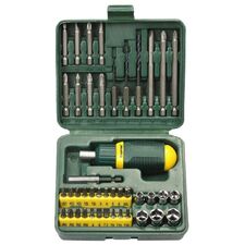 Количество предметов: 43 предмета Описание: Предназначен для монтажа и демонтажа резьбовых соединений. Биты из хромомолибденовой стали. Отвертка оснащена реверсивным храповым механизмом. Направление вращения меняется одной рукой. Магнитный держатель обеспечивает быструю замену насадок....