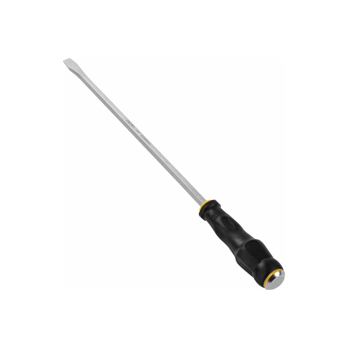Ударная шлицевая отвертка используется для работ с резьбовыми соединениями в процессе ремонта или монтажа. Металлический затыльник рукоятки позволяет использовать инструмент вместе с молотком в процессе откручивания сложных винтов и гаек. Стержень выполнен из качественной хромованадиевой стали, что обеспечивает высокую антикоррозийную стойкость и долговечность.