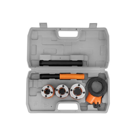 1.Набор клуппов SPARTA 1/2"-3/4"-1"+ плашкодержатель с трещоткой, 6 предм 773335 упакован в удобный пластмассовый кейс.