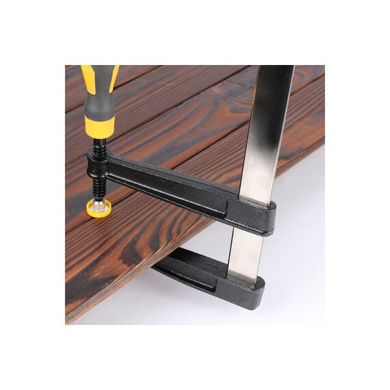 Столярная F-образная струбцина используется в столярном, слесарном и плотницком деле и позволяет фиксировать заготовки из металла, древесины, пластика и других материалов для их соединения, обработки, склеивания, шлифовки, сверления и пр. Ширина зажима составляет 300 мм, а глубина до 120 мм. Штанга изготовлена из высококачественной стали А3 и толщиной 5 мм устойчива к деформации и прослужит долго. Диаметр резьбового стержня 12 мм. Максимальное усилие зажима 2000 Н. Эргономичная, двухкомпонентная рукоять удобно лежит в руке и обеспечивая комфорт во время работы.