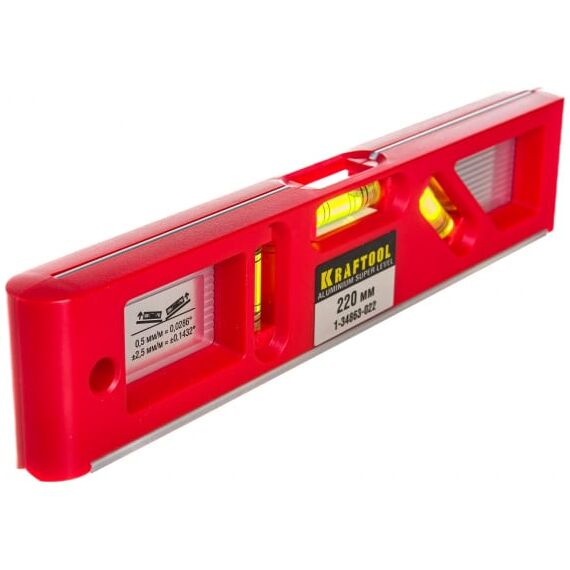 Уровень с магнитом DIRECTOR LEVEL 220 мм KRAFTOOL 1-34863-022 - это прибор, который служит для определения отклонений поверхности от горизонтальной и вертикальной плоскости. Применяется, например, при монтаже труб, стоек, полок и т.д. Уровень имеет встроенный магнит, который позволяет легко крепить его к металлическим поверхностям. Прибор оснащён 3 ампулами из ударопрочного плексигласа- горизонтальной, вертикальной и расположенной под углом 45 градусов.
