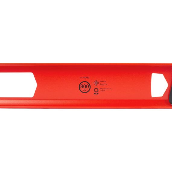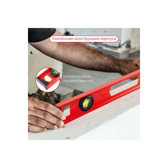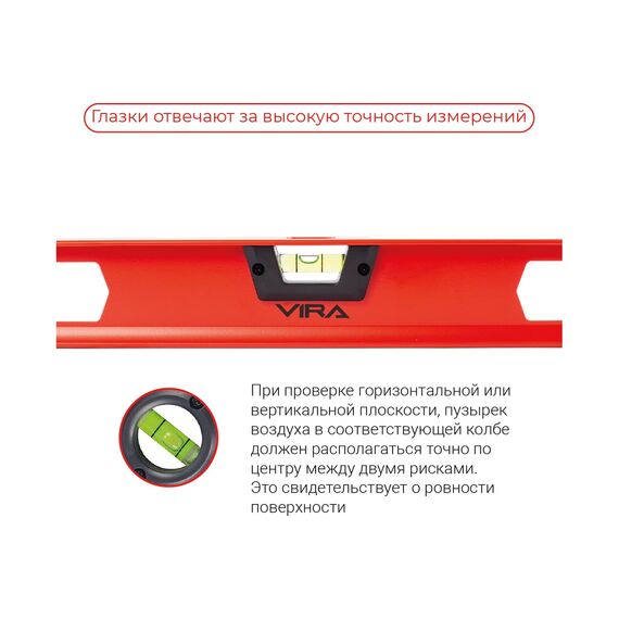 Уровень двутавровый 2 глазка и линейка 800 мм VIRA имеет усиленный корпус, что придает ему высокую прочность и устойчивость. Встроенные глазки отвечают за высокую точность измерений.