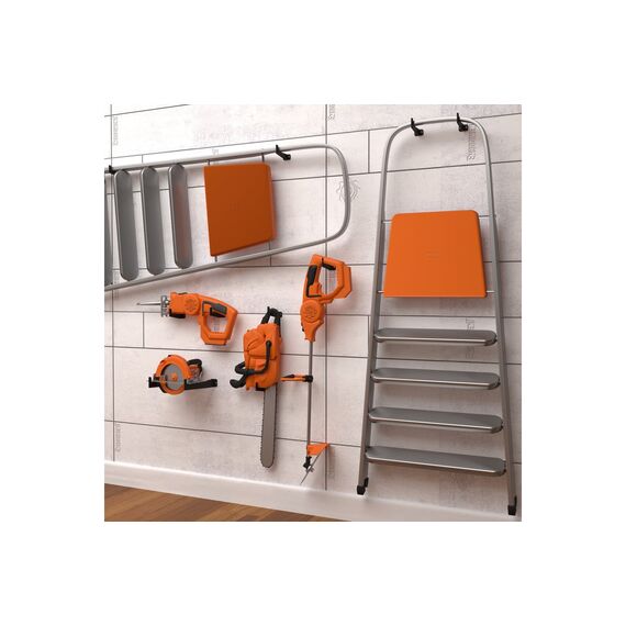 Совместное использование предлагаемых позиций позволит зафиксировать необходимый предмет, который не превышает заявленную нагрузку, такие как: Электроинструмент: Сабельная пила; Триммер аккумуляторный; Газонокосилка; Цепная пила; Дисковая пила; Циркулярная пила Бытовые предметы: Светильники; Цветы с кашпо; Лыжи Лестницы и стремянки; лопаты, грабли, косы, мотыги, садовые вилы, а так же веревки и садовые лейки и другие изделия.