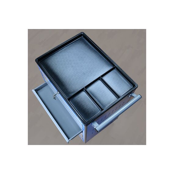 - На крыше тележки установлен формованный лоток, выполненный из АБС-пластика толщиной 2 мм В лотке имеется одно большое основное отделение и три малых отделения для хранения метизов и небольшого инструмента