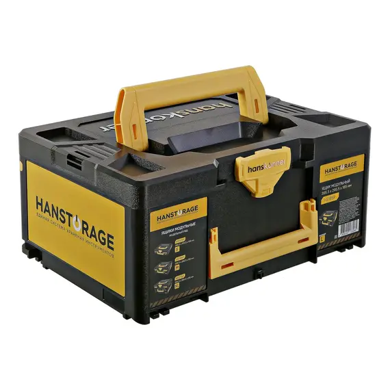 Ящик предназначен для хранения и транспортировки инструмента и инвентаря, может использоваться как отдельно, так и совместно с другими типоразмерами единой системы хранения HANSTORAGE ( S,M,L,XL), образуя при этом единый модуль. К отличительным особенностям можно отнести: HansLock - универсальный поворотный замок, позволяющий без лишних усилий открыть/закрыть ящик или состыковать их между собой; материал изготовления - ударопрочный пластик, обеспечивающий сохранность внутреннего содержимого при этом, допустимая нагрузка на крышку составляет 100кг; ящик имеет 2 фиксируемые рукоятки для возможности его перемещения и легкого извлечения из стеллажа.