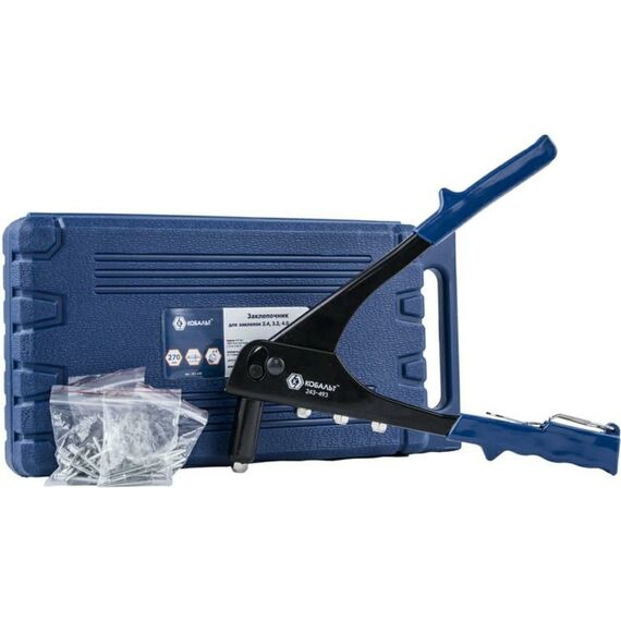 Заклепочник КОБАЛЬТ 270 мм кейс 243-493 снабжен головкой, которая работает с 4 сменными насадками. Корпус изготовлен из стали и обладает прорезиненными рукоятками. Инструмент используется для скрепления листов стали друг с другом при помощи вытяжных заклепок из алюминия. Заклепочник поставляется в кейсе с насадками.