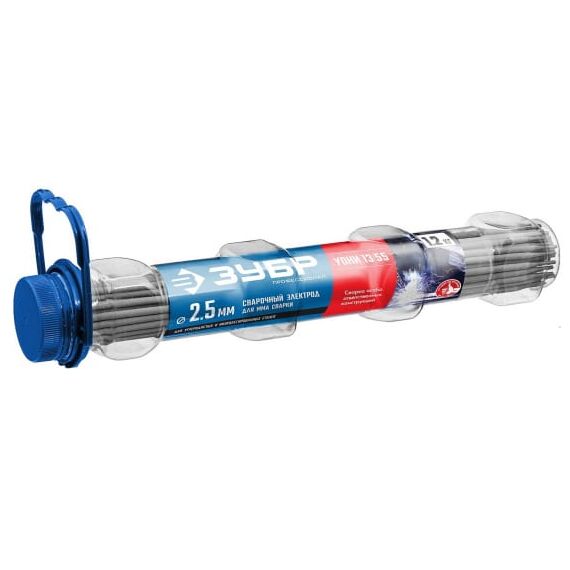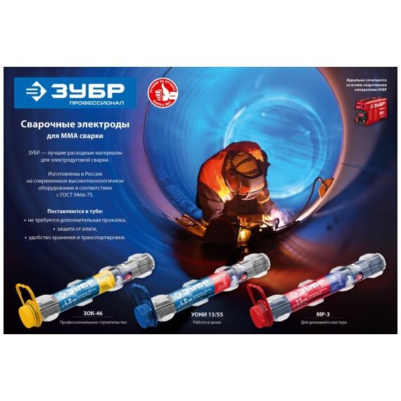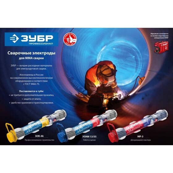 Электрод сварочный ЗУБР Профессионал УОНИ 13/55 с основным покрытием, 2.5х350 мм, 1.2 кг 40021-2.5 изготовлен в России на современном высокотехнологичном оборудовании по оригинальной технологии и рецептуре в соответствии с ГОСТ 9466-75.