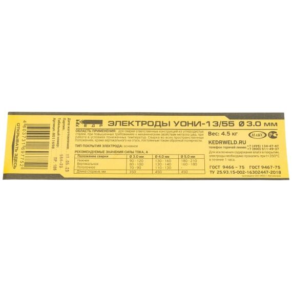 Электроды УОНИ 13/55 КЕДР 8011698 предназначены для сварки ответственных конструкций из углеродистых сталей. Сварка ведется во всех пространственных положениях, кроме вертикального сверху вниз. Работы следует проводить постоянным током обратной полярности. Наплавленный металл образует ровный и плоский шов.