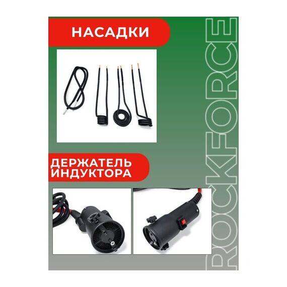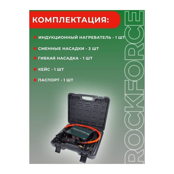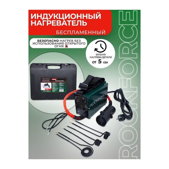 Индукционный нагреватель ROCKFORCE портативный прибор - беспламенный нагреватель болтов и гаек для автосервиса, строительной сферы, производств и др. Комплектуется насадками различной модификации. Индукционный нагреватель используется в ремонтных мастерских и цехах и предназначен для нагрева металлических деталей: гаек, болтов, рычагов, тяг и других металлических поверхностей. Главное преимущество данного устройства, что при выполнении работ не используется открытый огонь - безопасный в использовании. Прибор имеет небольшие габариты, но при этом имеет высокий КПД.