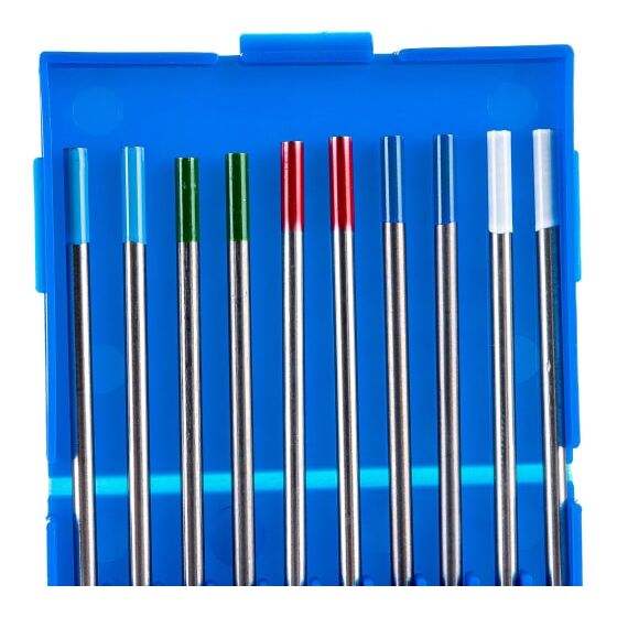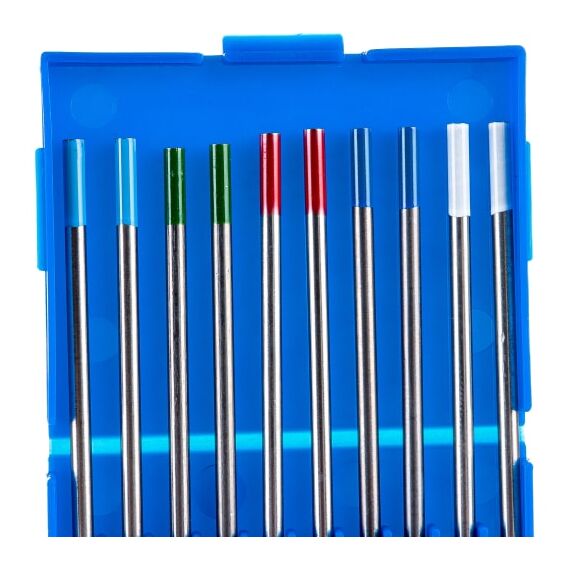 В набор вольфрамовых электродов входят 5 видов: WL-20 - синий, WP - зеленый, WT-20 - красный, WY-20 - темно-синий, WZ-8 - белый. В наборе каждого вида электрода по 2 шт. диаметром 2.4 мм.