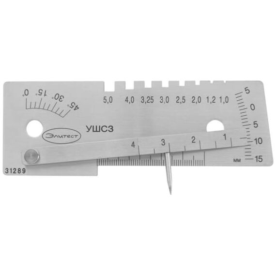 Универсальный шаблон сварщика УШС-3 (альтернативное название — универсальный шаблон сварщика УШС-3М) предназначен для визуального и измерительного контроля стыкуемых деталей, параметров стыкового шва и дефектов. Крупные шкалы шаблона обеспечивают удобство считывания показаний. Острый наконечник измерительного движка шаблона отлично подходит для измерения вогнутости корня стыкового шва и глубины подрезов, а пазы на основании шаблона позволяют оперативно определить диаметр электродов или сварочной проволоки непосредственно на месте проведения работ.
