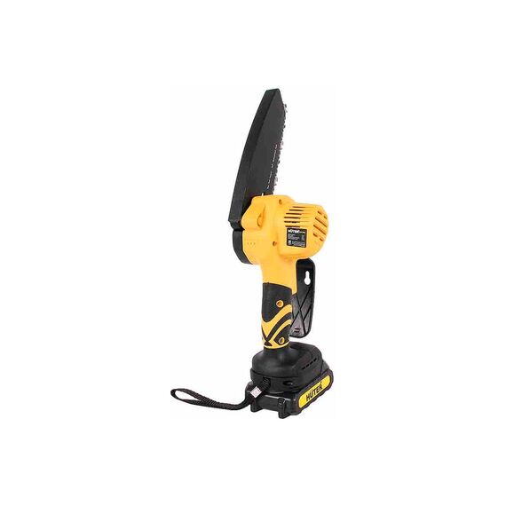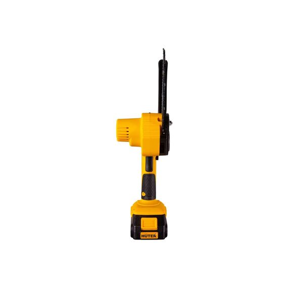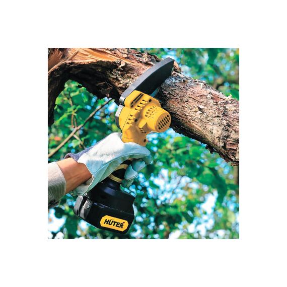Емкость батареи составляет 2 А*ч, поэтому можно работать без дополнительной зарядки продолжительное время. В комплект входит 2 аккумулятора, что позволяет пилить практически непрерывно. Электропила данной модели отличается высокой производительностью и способна пилить со скоростью 6,5 м/с. Комплектуется инструмент шиной длиной 150 мм (6 дюймов), поэтому не может использоваться для распиливания крупной древесины.