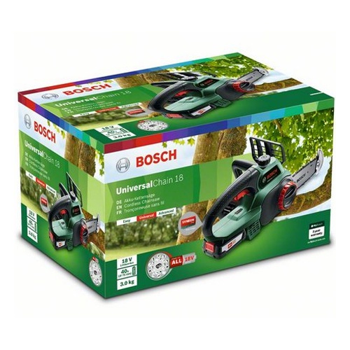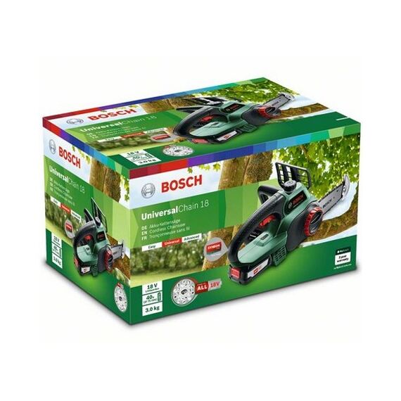Аккумуляторная цепная пила UniversalChain 18 - универсальное решение для тех, кто ищет компактный инструмент без потери в мощности. Цепная пила занимает среднее положение между традиционной цепной пилой и пилой для веток деревьев, обеспечивая средний диаметр среза от 7 до 13 см. Компактность корпуса повышает маневренность инструмента, что помогает не повредить соседние ветки при спиливании. Благодаря запатентованной системе защиты наконечника подрезка веток становится очень простым делом: ветки можно подрезать, когда они лежат на земле. Опираясь наконечником о пол, между цепью и землей образуется расстояние, за счет которого цепь может вращаться и не задевать поверхность земли. Благодаря системе SDS можно натянуть или заменить цепь без использования дополнительных инструментов. Инструмент обладает технологией Syneon Chip, которая автоматически "дозирует" подаваемую энергию на привод пилы в зависимости от возникающей нагрузки