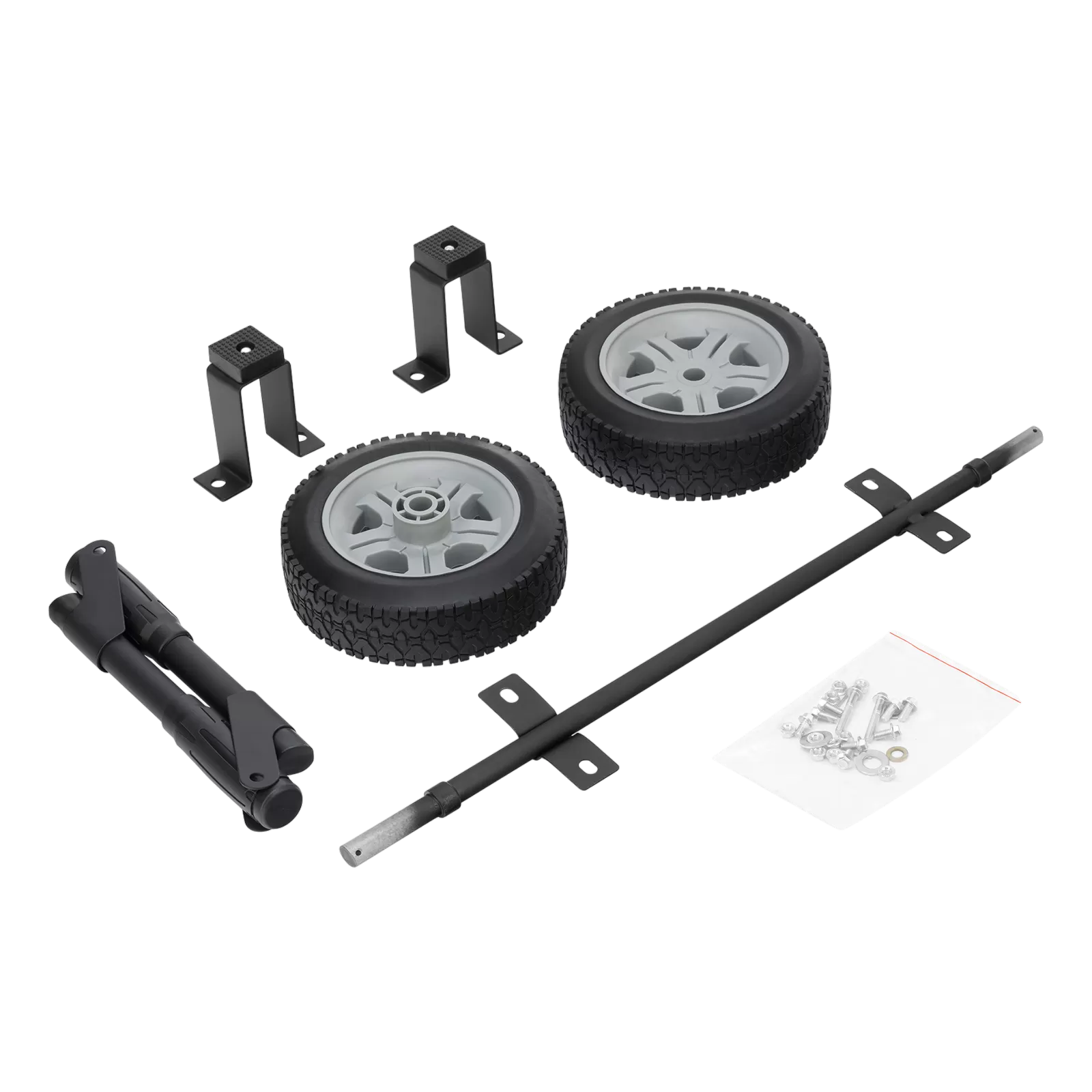 Ручка - 2 шт, колесо - 2 шт, опора - 2 шт, ось - 1 шт, скоба крепления оси - 1 шт, болт с фланцем М8 - 2 шт, малый болт с фланцем М8 - 8 шт, гайка с фланцем М8 - 10 шт, шайба - 4 шт, шплинт - 2 шт