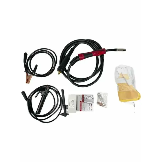 Сварочный аппарат 1 Силовой кабель с зажимом 1 Силовой кабель с электрододержателем 1 Сварочная горелка 1 Шланг 1 Зачистная щетка-молоток 1 Руководство по эксплуатации 1 Упаковка 1