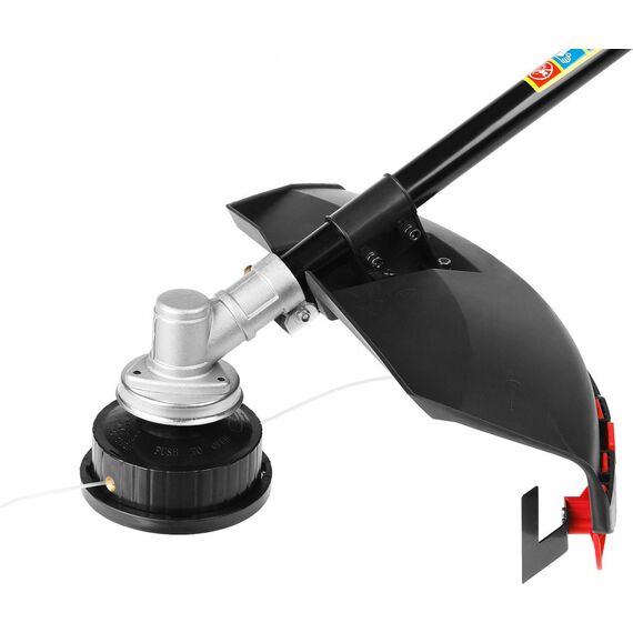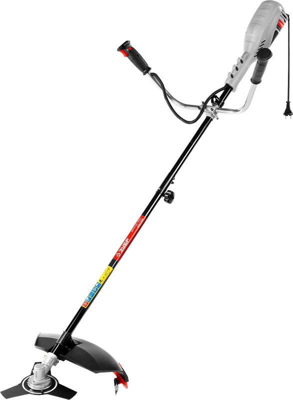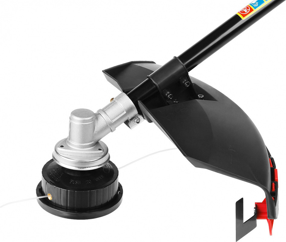 Особенности: Универсальный инструмент на участке. Способна заменить газонокосилку и триммер, так как оснащается катушкой с леской (для мягкой растительности) и ножом (для грубой растительности). Большая мощность двигателя позволяет косить довольно густую и грубую растительность.