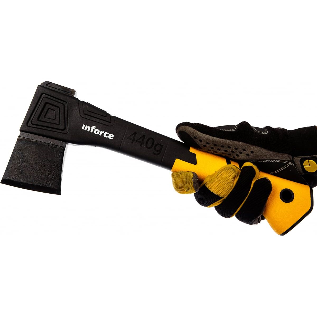 Универсальный топор 440 г Inforce 06-12-18 дополнен специальным чехлом с фиксатором, при помощи которого лезвие инструмента не повреждается при перевозке.