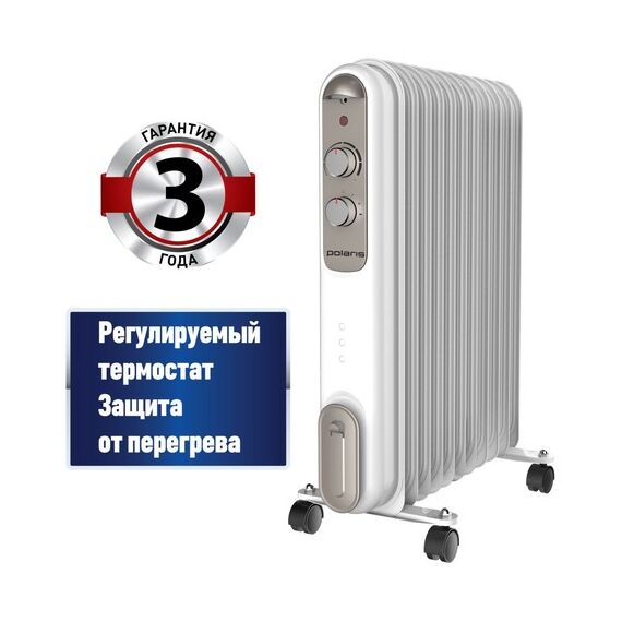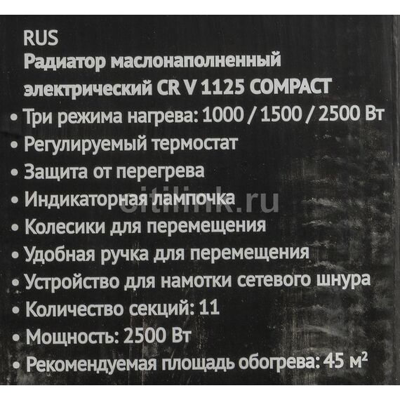мощность 2500Вт; количество секций: 11; площадь обогрева: до 45 кв.м; управление: механическое; встроенный термостат; выключение при перегреве; ручка для перемещения; регулировка мощности; цвет: белый