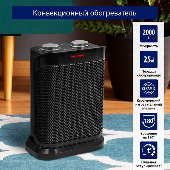 Технология принудительного конвекционного нагрева за счет вращения вентилятора обладает максимальной теплоотдачей и энегоэффективностью, по сравнению с обогревателями других типов. Тепловентилятор оснащен высокоэффективным керамическим нагревательным элементом, высокой мощности. Благодаря этому прибор мгновенно выходит на рабочую температуру и быстро обогревает помещение.