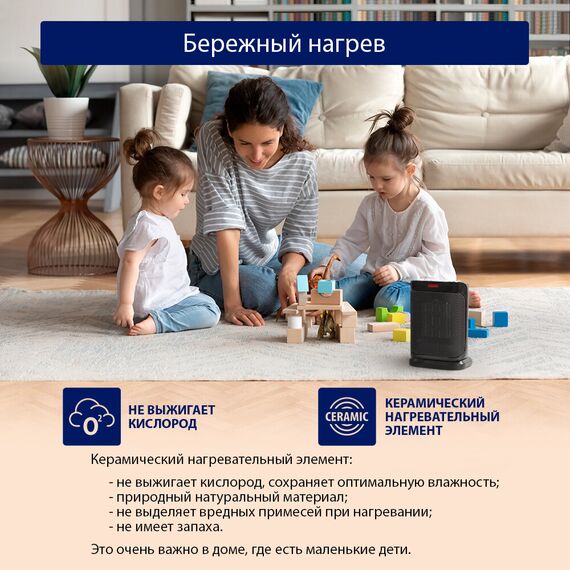 Керамический нагревательный элемент нового поколения создан из природного натурального материала, не выделяет вредных примесей при нагревании, не имеет запаха и очень быстро достигает рабочей температуры, при этом не выжигая кислород, сохраняя влажность воздуха оптимальной.