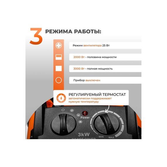 Трёхступенчатый регулятор тепловой мощности позволяет настроить интенсивность обогрева в зависимости от потребностей, а регулируемый температурный термостат гарантирует стабильность температуры в помещении. Защита от перегрева обеспечивает безопасность использования пушки.