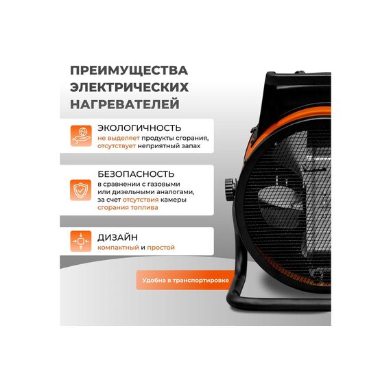 Пушка тепловая электрическая ECOTERM EHR-03/1F (ET3722-2) - идеальный выбор для бытового использования. Она работает от обычной электрической сети, что делает её доступной и экономичной. Высококачественные керамические ТЭНы обеспечивают долгий срок службы и равномерный обогрев.