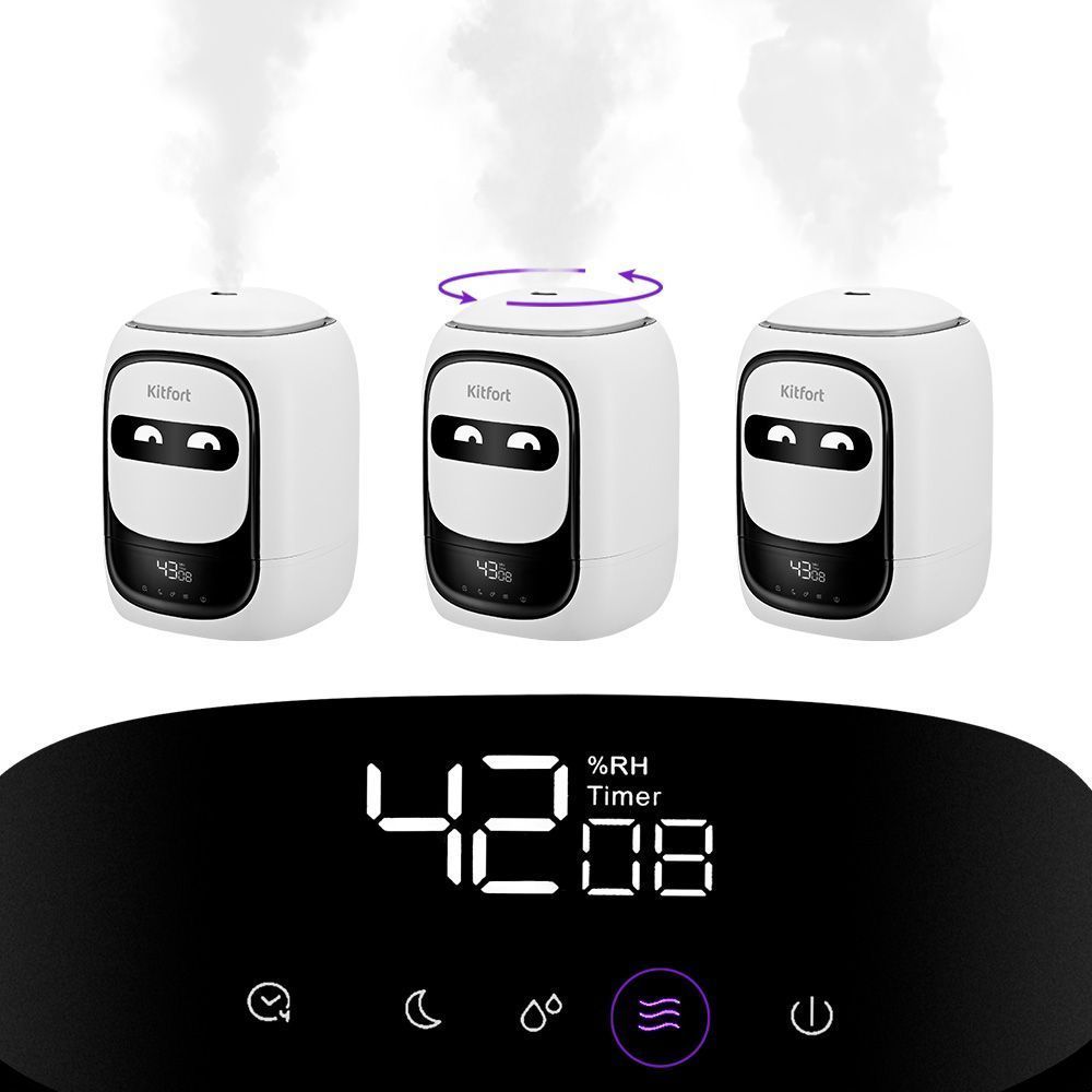 Увлажнитель генерирует не горячий пар, а холодный туман. Частицы тумана мелкие, они обладают большой суммарной поверхностью, а потому быстро испаряются, что приводит к повышению влажности воздуха. Сопло для выхода тумана можно поворачивать на 360°.
