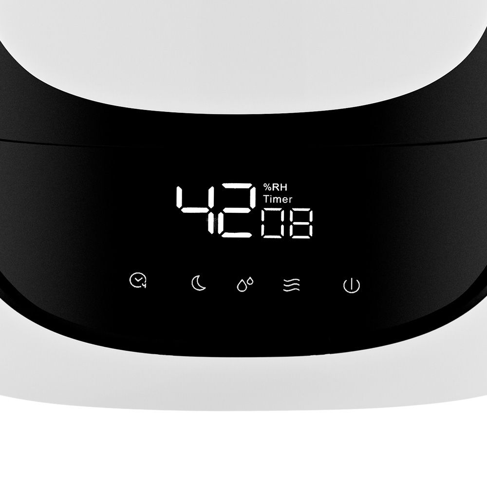 Вы можете задавать желаемый уровень влажности от 40 до 90% с шагом 5%, а также время работы увлажнителя - от 1 до 12 ч с шагом 1 ч. На дисплее отображаются текущая влажность и таймер. Вы можете выключить дисплей, воспользовавшись кнопкой “Ночной режим”.