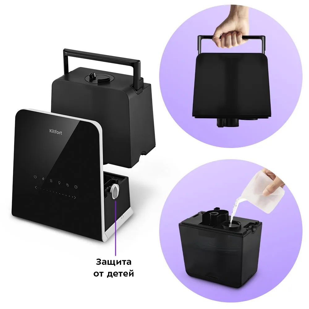 Резервуар для воды ёмкостью 5,5 литра съёмный. У резервуара есть удобная ручка. У данной модели увлажнителя предусмотрена защита от детей: резервуар для воды можно зафиксировать на основании увлажнителя.