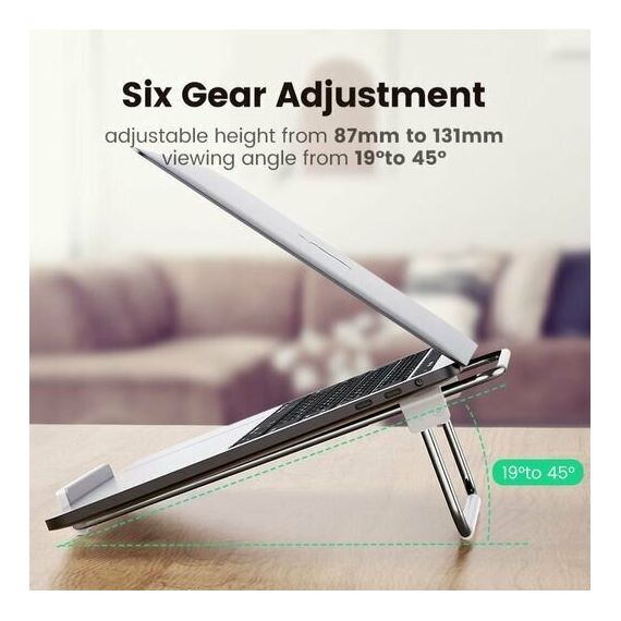 Универсальная подставка предназначена для удобного размещения ноутбука на рабочем столе. Подставка складывается и очень удобная при ежедневном использовании. Ноутбук удерживается при помощи фиксатора в нижней части подставки. Такая система позволяет беспрепятственно получать доступ к разъёмам ноутбука по всему периметру. Угол положения подставки регулируется в диапазоне от 0 до 45 градусов и позволяет зафиксировать ноутбук в удобном положении.