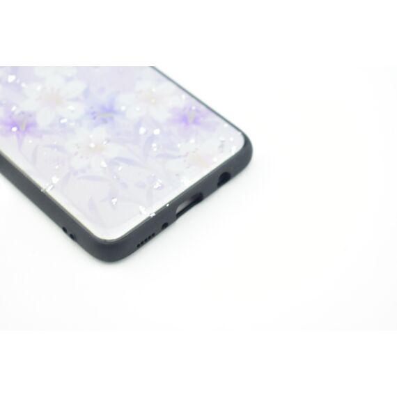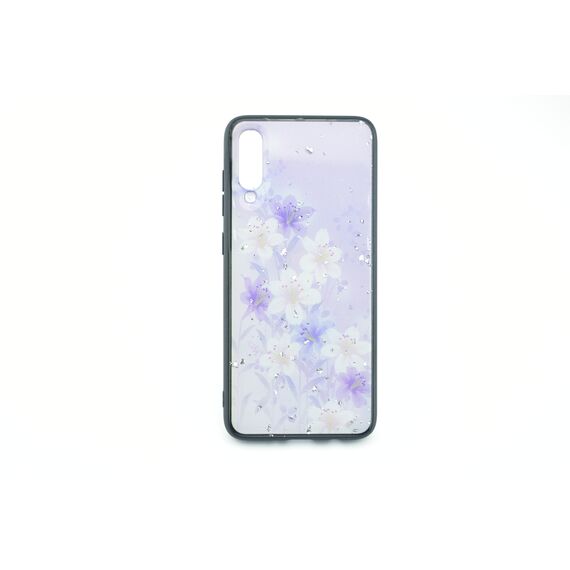 Накладка имитация стекла с силиконовыми краями и блестками для Samsung Galaxy A70 с рисунком "Лилии", светло-фиолетовый (4)