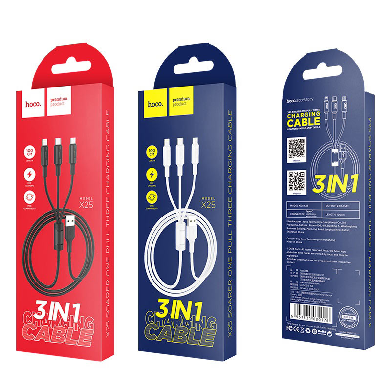 Зарядный кабель X25 Soarer 3-в-1 для соединения Lightning Micro-USB Type-C с удлиненным концом, качественный и долговечный, с низкой стоимостью, номинальный ток 2А, длина 1 м