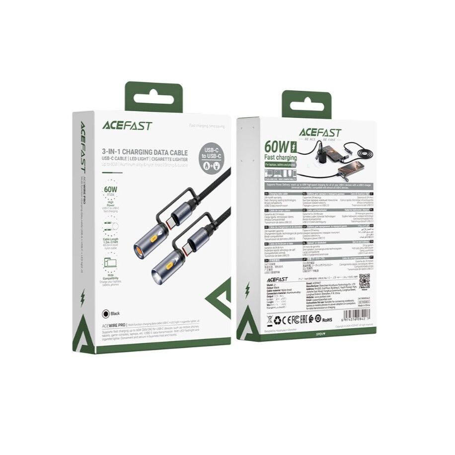Кабель ACEFAST AF-J4-BK Multi-Function Charging Data Cable USB-C+ Led Light + Cigarette Lighter Black