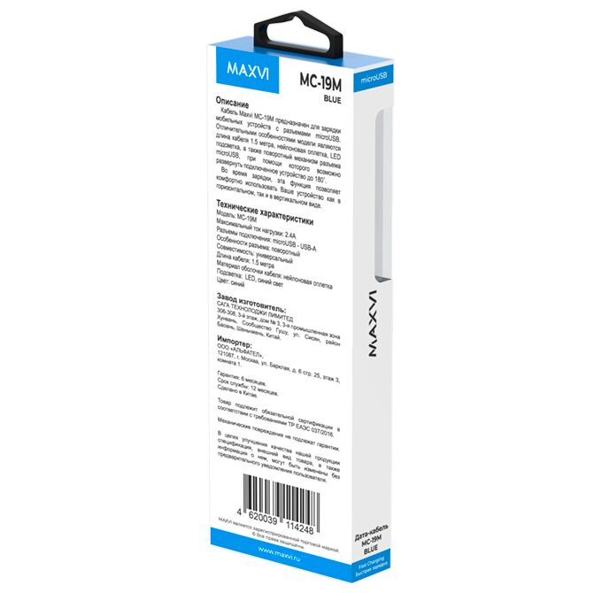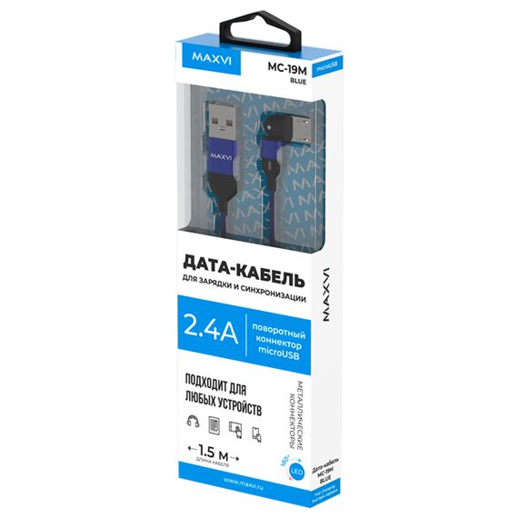 Кабель Maxvi MC-19M blue, USB-A-microUSB, 2.4A, LED