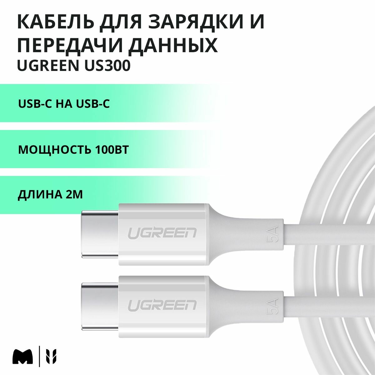 Кабель UGREEN US300 60552 Type-C Male to Type-C Male 2.0 ABS Shell 5A Current 2m White