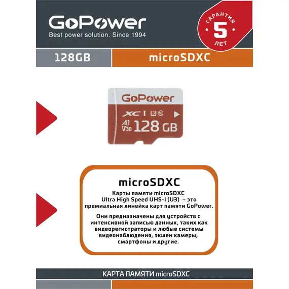 Карта памяти GoPower 00-00025683 microSD 128GB Class10 UHS-I (U3) 100 МБ/сек V30 без адаптера