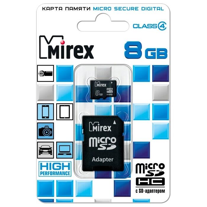Карта памяти Mirex microSD 8GB microSDHC Class 4 (SD адаптер) (13613-ADTMSD08)