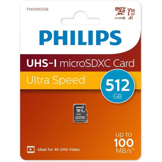 Карта памяти PHILIPS FM51MD55B/97 512GB High Speed microSDHC Class UHS-I U3, V30, A1, 100MB/s
