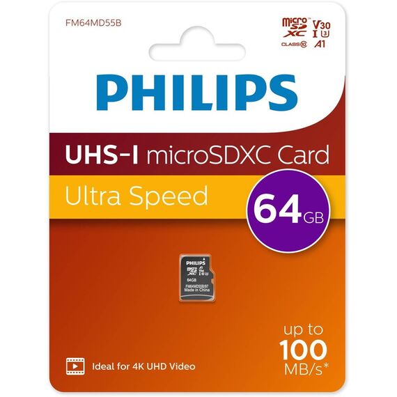 Карта памяти PHILIPS FM64MD55B/97 64GB High Speed microSDHC Class UHS-I U3, V30, A1, 100MB/s
