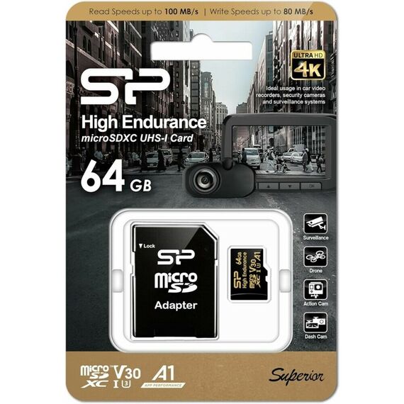 Карта памяти Silicon Power SP064GBSTXDV3V1HSP 64GB microSDHC Class 10 UHS-I A1 V30 U3 (SD адаптер) 100MB/s