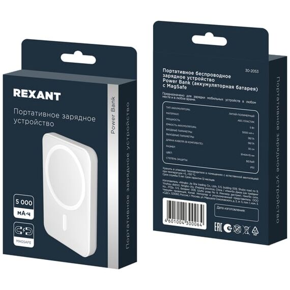 Power Bank REXANT 30-2053 5000 mAh, MagSafe, белое