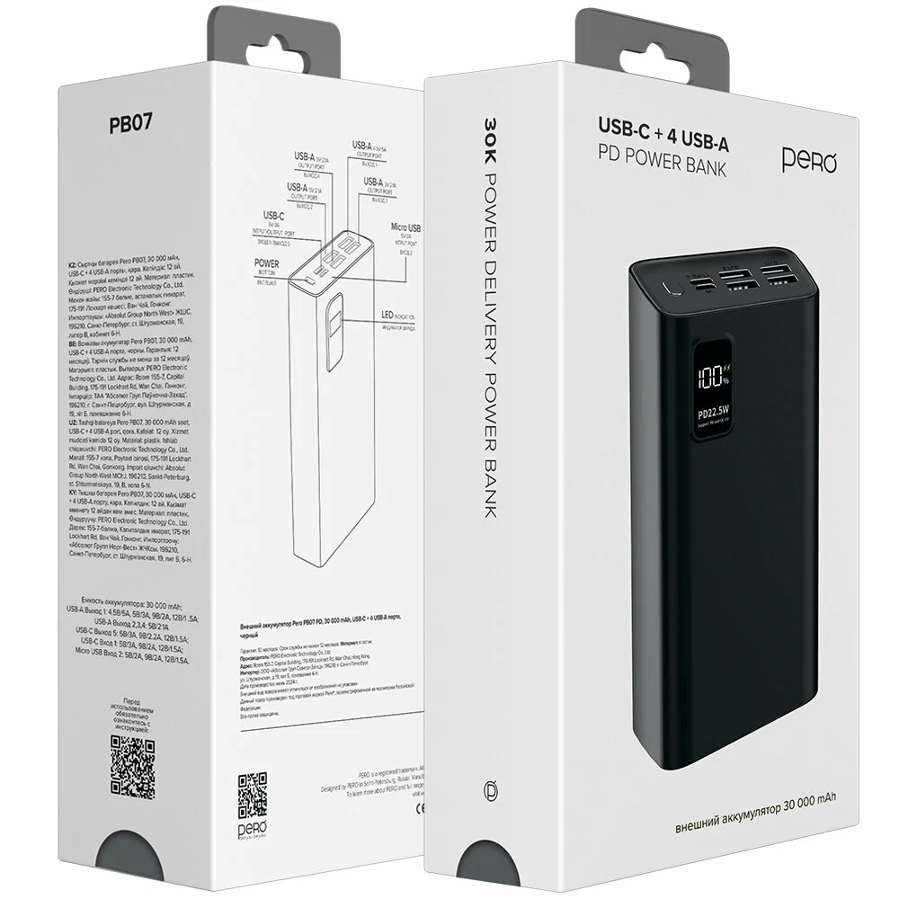 Внешний аккумулятор PERO PB07 30000mAh, Li-Pol, output USB-C + 4 USB-A черный