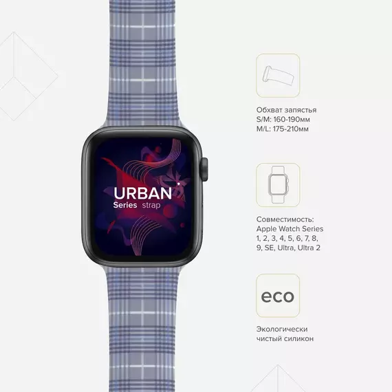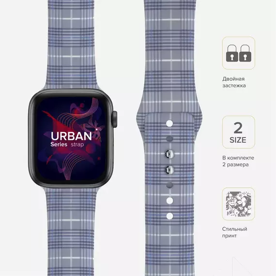 Ремешки серии Urban - созданы для активных людей, живущих в быстром темпе города, в этой серии использован популярный, модный принт "Клетка". Ремешок изготовлен из специального высокопрочного силикона. Этот вид силикона используется в пищевой промышленности, обладает всеми свойствами этого качественного материала, и не вызывает аллергии. Ремешок из такого материала комфортно сидит на руке, силикон плотный, гладкий и приятный на ощупь. Двойная застёжка из нержавеющей стали надёжно фиксирует ремешок на запястье.