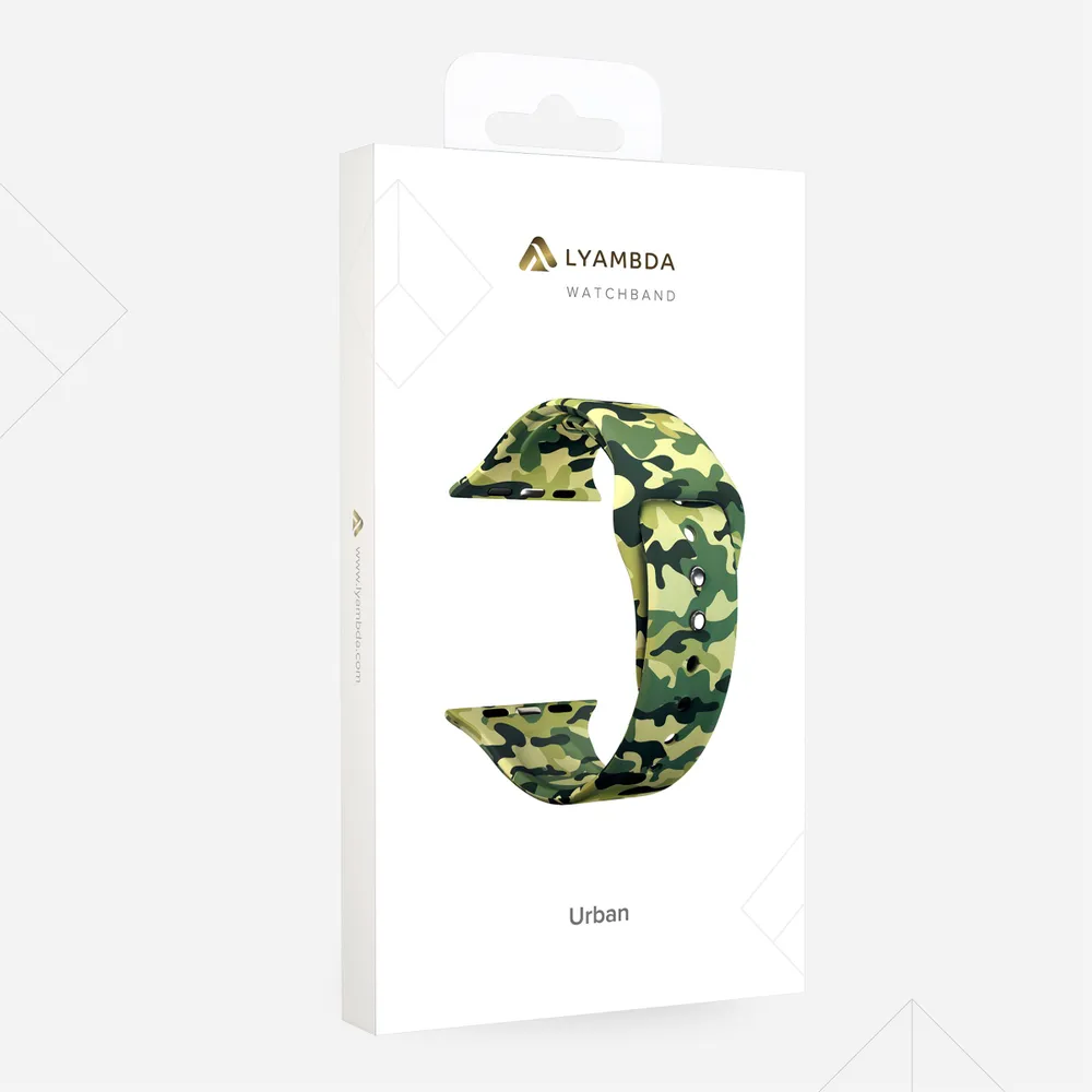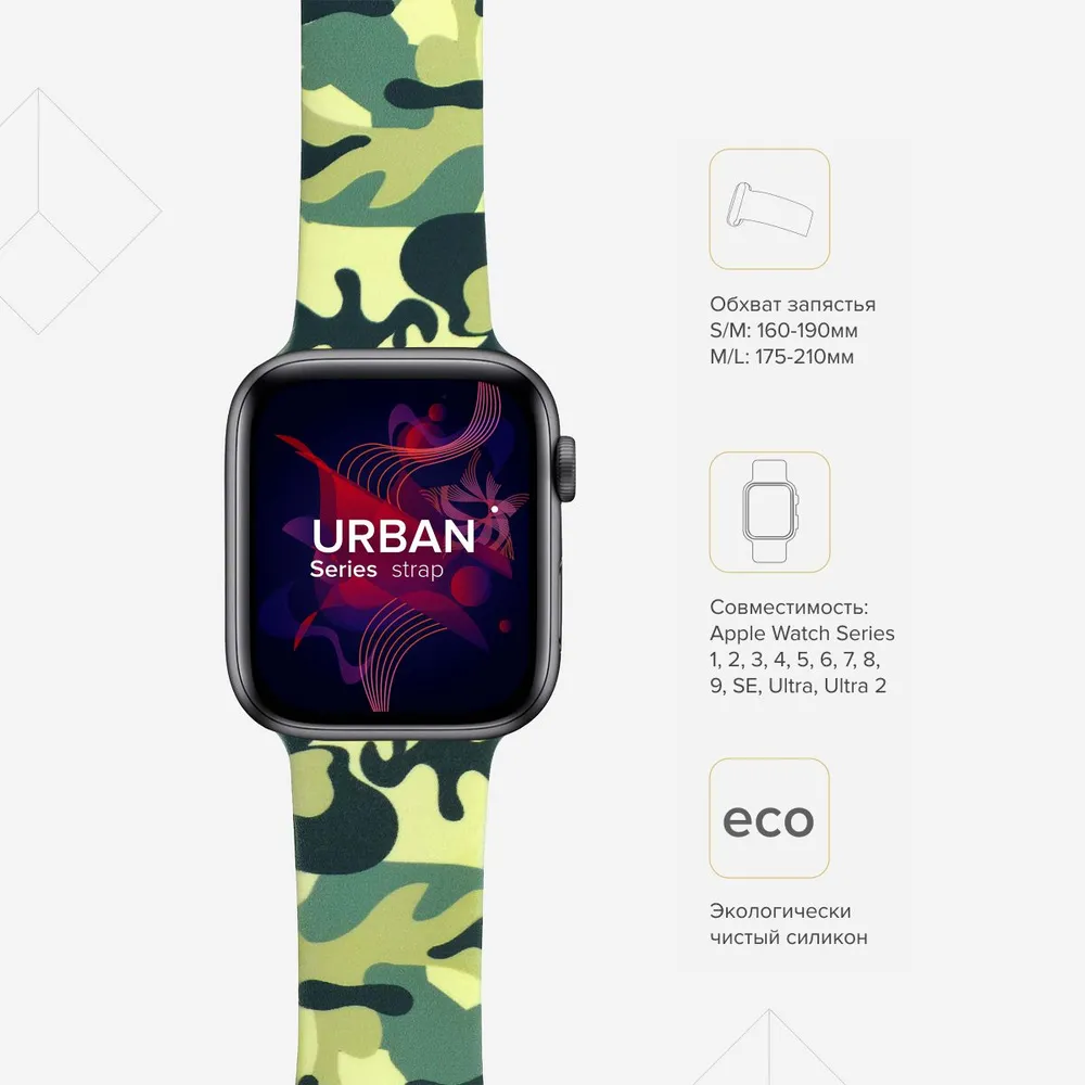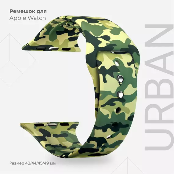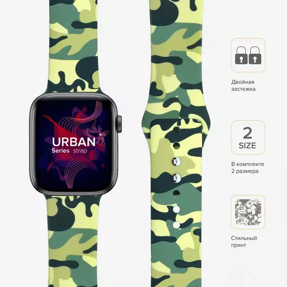 Ремешки серии Urban - созданы для активных людей, живущих в быстром темпе города, в этой серии использован популярный, модный принт "Камуфляж". Ремешок изготовлен из специального высокопрочного силикона. Этот вид силикона используется в пищевой промышленности, обладает всеми свойствами этого качественного материала, и не вызывает аллергии. Ремешок из такого материала комфортно сидит на руке, силикон плотный, гладкий и приятный на ощупь. Двойная застёжка из нержавеющей стали надёжно фиксирует ремешок на запястье.