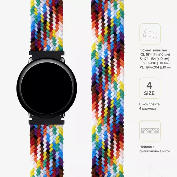 Ремешок комфортно сидит на руке, не имеет каких-либо застежек, замков или пряжек – это позволяет снять или надеть аксессуар быстро и без особых усилий. Отлично выводит влагу, благодаря чему может использоваться в активных занятиях спортом. Мы предусмотрительно позаботились о вас, ведь в каждой упаковке четыре ремешка на разные размеры запястья от 16,1 см до 20,4 см.