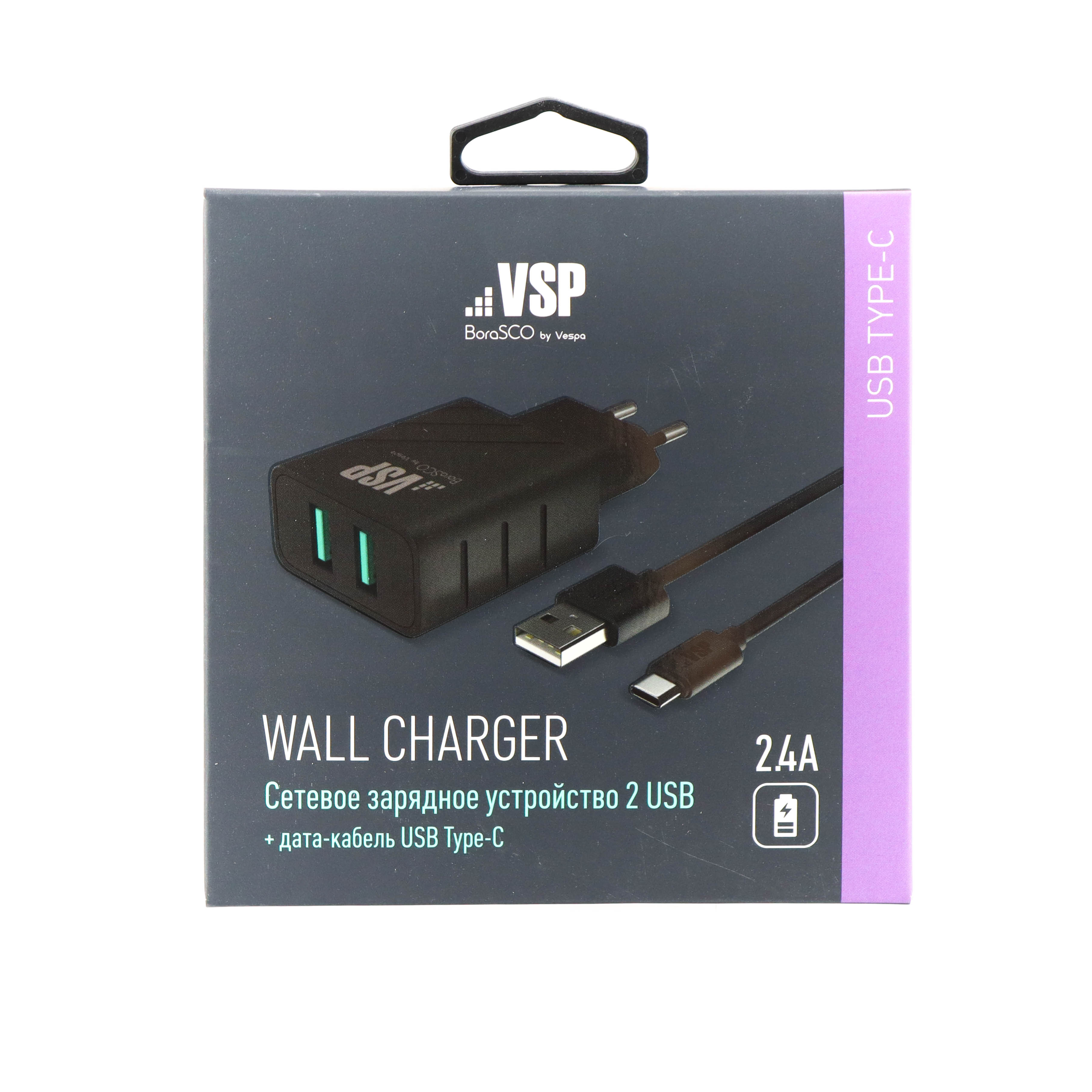 СЗУ 2 USB, 2,4A + Дата-кабель Type-C, 1м, черное, BoraSCO (VSP)