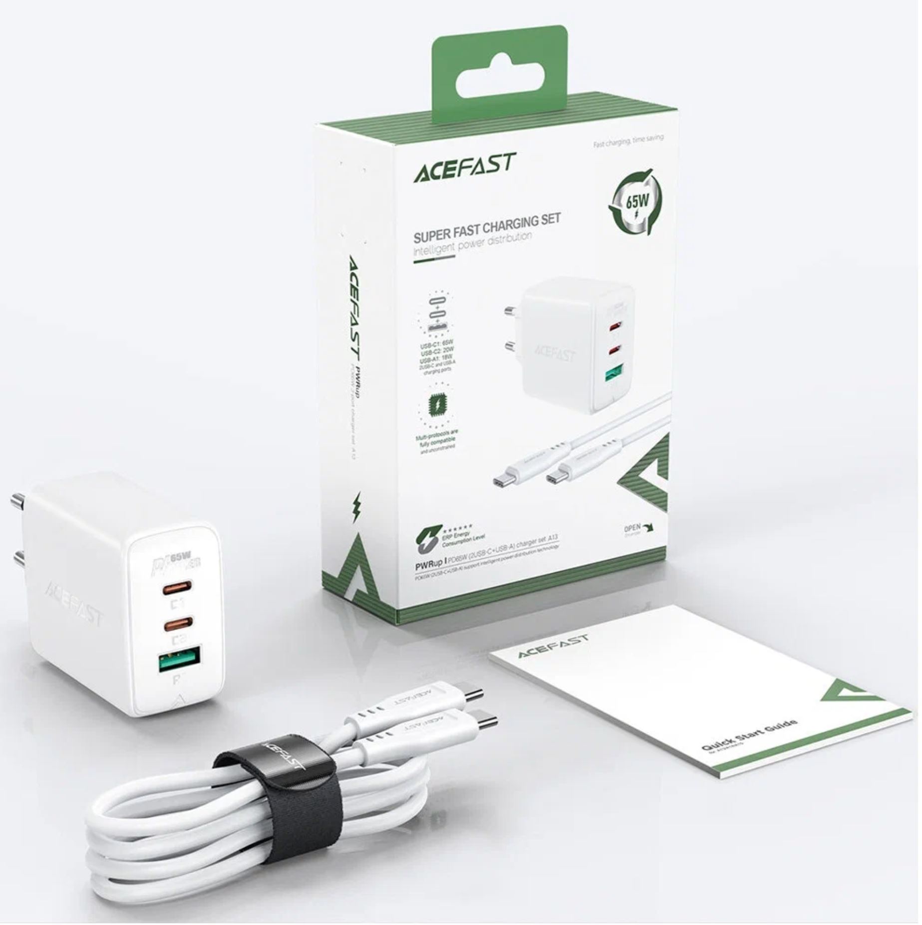 СЗУ ACEFAST A13 AF-A13-WH PD65W USB-C+USB-C+USB-A 3-port charger set EU White