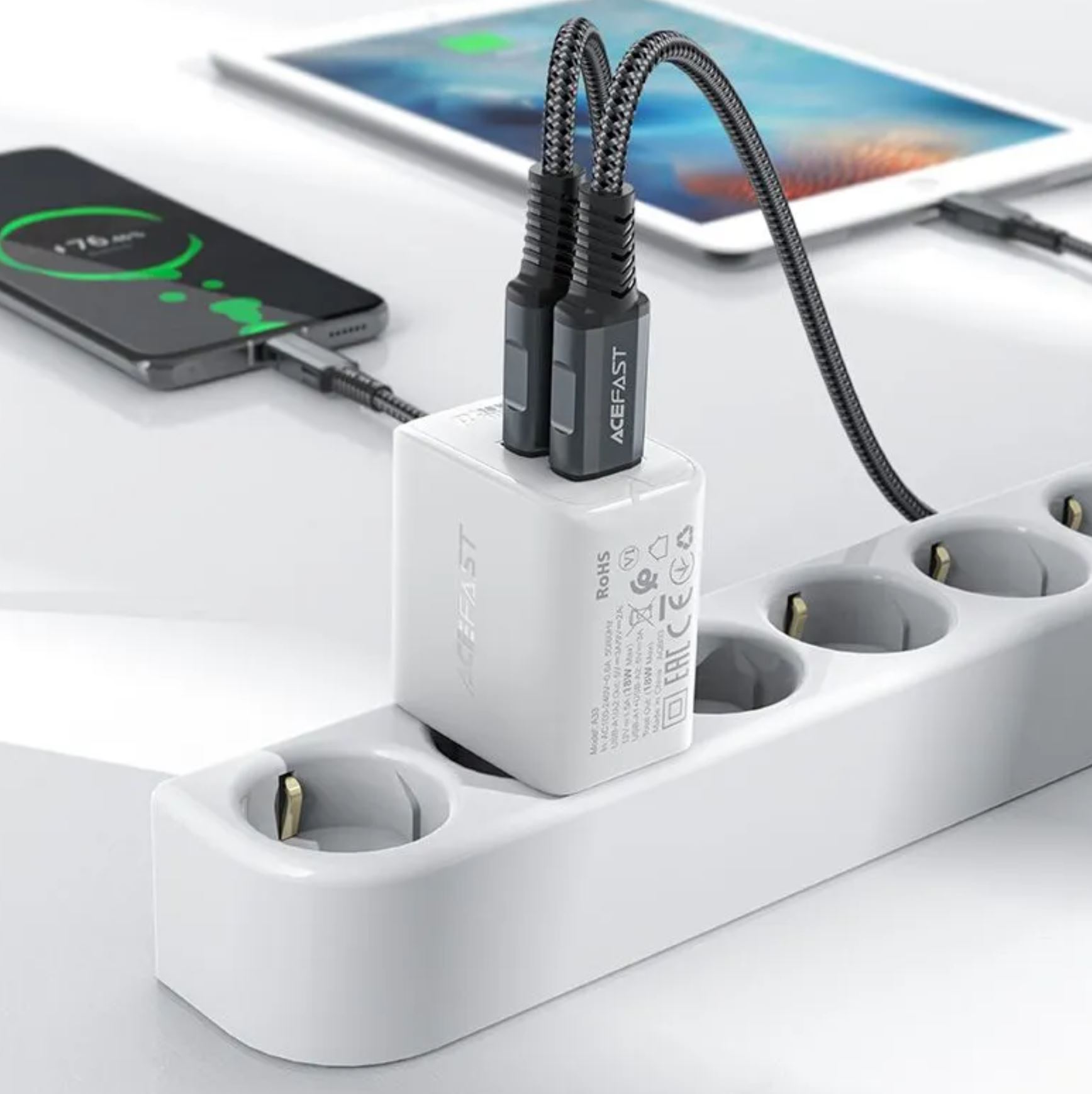 СЗУ ACEFAST A33 AF-A33-WH QC18W USB-A+USB-A dual port charger EU White